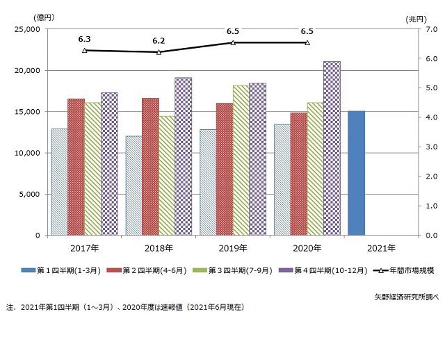 また、2020年度(2020年4月~2021年3月)の市場規模(速報値)は、前年度比1.6%増の6兆6996億円と推計。上期(4~9月)は、新型コロナウイルス感染拡大の影響で前年度同期比9.7%減となったが、下期(10~3月)は同13.6%増と上期のマイナス分を取り戻す形となった。