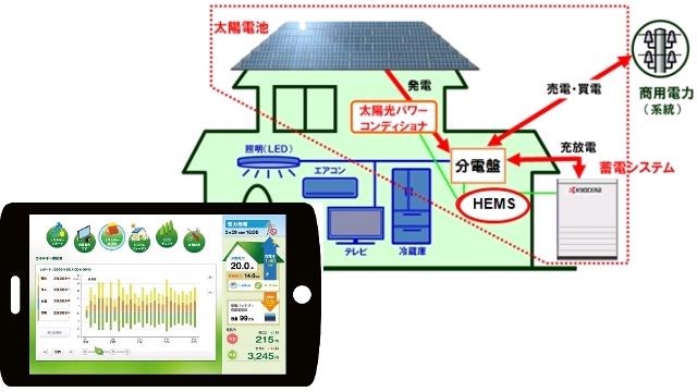 家庭用エネルギー管理システム(HEMS)を組み合わせることで、パソコンやテレビ、スマートフォンなどで、エネルギーの状況の「見える化」にも対応する。