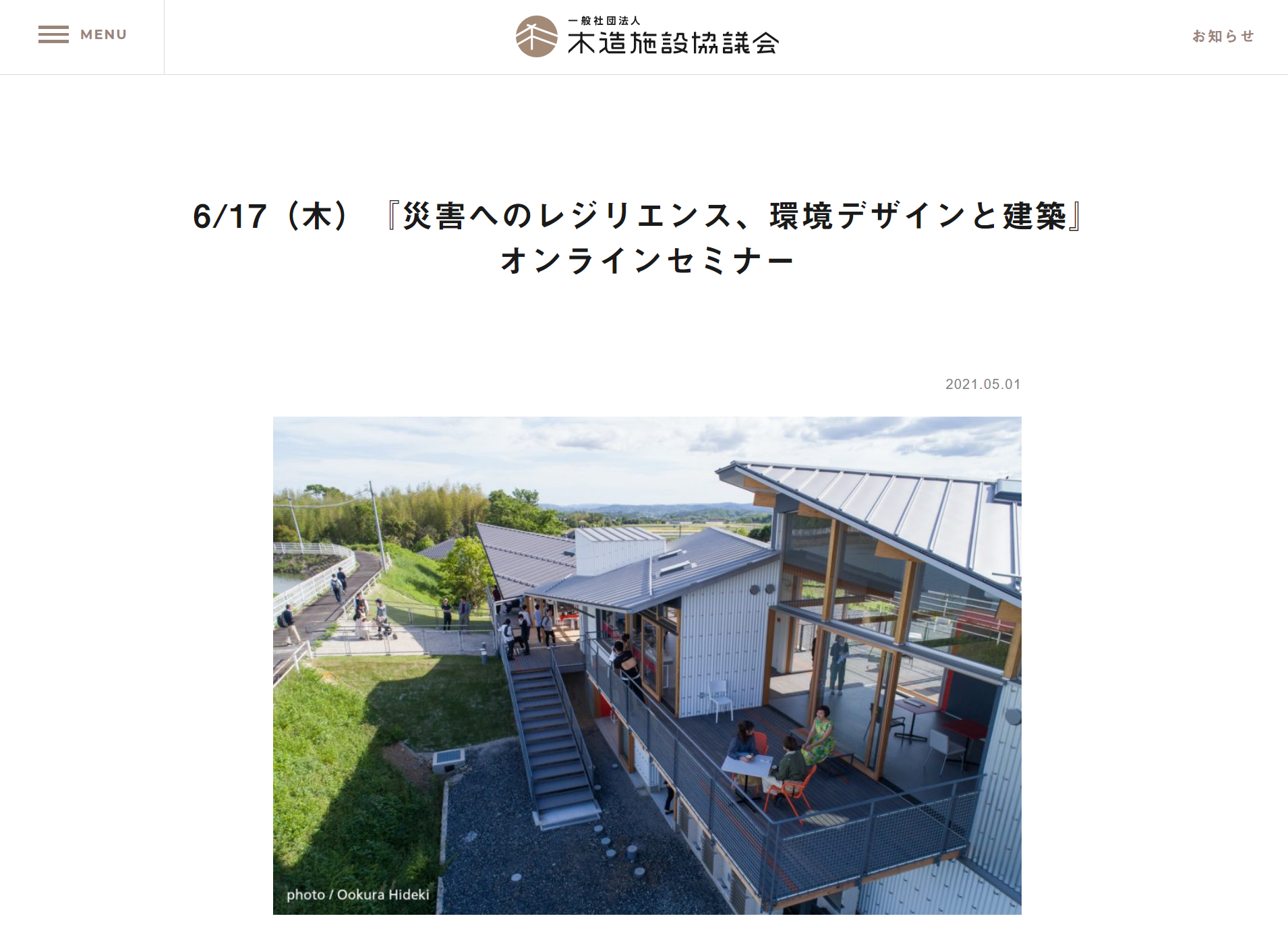 (一社)木造施設協議会は、自然災害発生時に住民の生活を守る避難シェルターとしての木造公共施設の設計手法を学ぼうと、地域の設計事務所・工務店・行政担当者向けのセミナーを6月17日(木)にオンラインで開催する。参加無料。