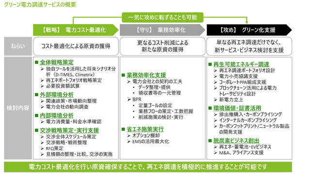 同サービスにより、電力コスト最適化サービスの結果削減された電気料金を原資に、業務効率化によるコスト削減などさらなる原資獲得ができるほか、グリーン電力の購入・再エネ設備の設置なども可能となるという。また、獲得した再エネアセットなどを活用した脱炭素ビジネス市場における新サービス・ビジネスへの展開戦略も支援する。