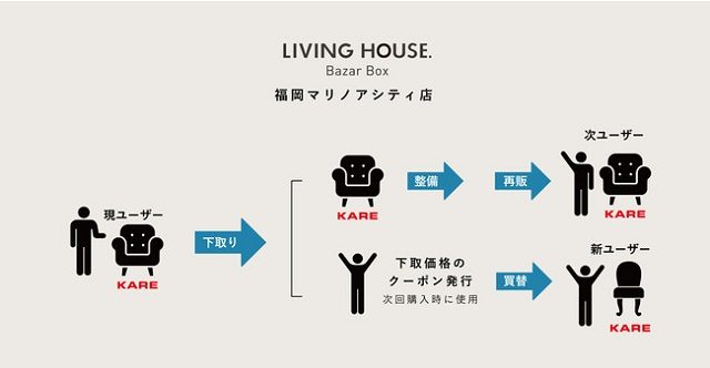 同日オープンした同社初のアウトレット店舗「リビングハウス バザーボックス マリノアシティ福岡店」にて、ドイツ・ミュンヘンのインテリアブランド「KARE(カレ)」の商品を購入した顧客が対象。事前に買取希望のKAREの購入家具をオンライン査定し、顧客が店舗に対象商品を持ち込んだ際に、次回使用できる下取りクーポンを発行する。引き取った家具は同店で下取りし、再販売を実施する。下取り参考価格は、購入時の10%~20%。対象商品は同店で購入したKAREの家具・アート(アウトレット購入品含む)。