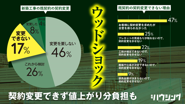 ウッドショックによる影響を踏まえて、工務店にとっては、木材の価格変動(高騰)に伴う契約金額の変更や調達困難による工期の遅延などについて、顧客(建築主)の合意を得て変更することが必要になっているが、同調査によると、新築工事では、すでに契約済みの案件について2割近くが「変更できない」と回答し、その理由として47%が「契約変更を求めたが顧客の合意を得られなかった」と回答した。木材の値上がり分などを、顧客に請求できずに自社で負担する「増嵩費用」は、回答者の平均で1件(新築工事)あたり約57万円にもなり、深刻な状況が浮き彫りとなった。・・・