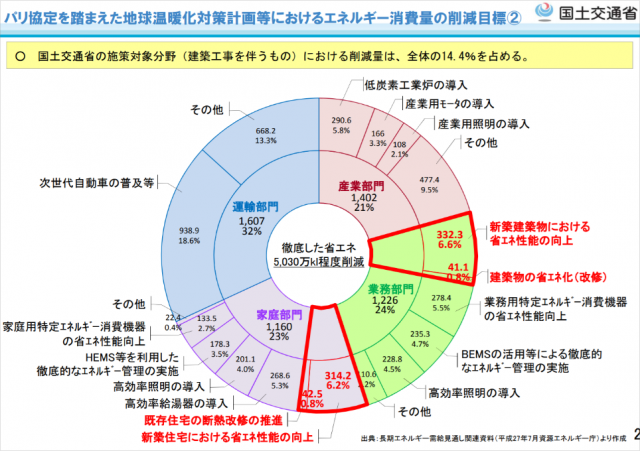 そのうち、住宅関連では「新築住宅における省エネ性能の向上」により、原油換算で356.7万キロリットルの削減(社会全体の約7%)が目標。このカテゴリーでは、