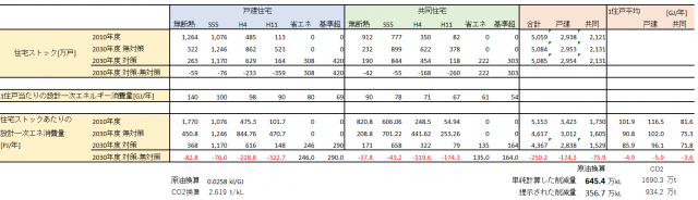 ここまでの計算結果をまとめてみると、住宅全体の一次エネルギー消費量は2010年の5153PJに対し、温暖化対策によって2030年、削減量は一次エネで250.2PJ(原油換算645.4万キロリットル=CO2削減量1690.3万t)となる。日本の2010年のCO2排出量が14億8千万tなので、削減率は1.1%。