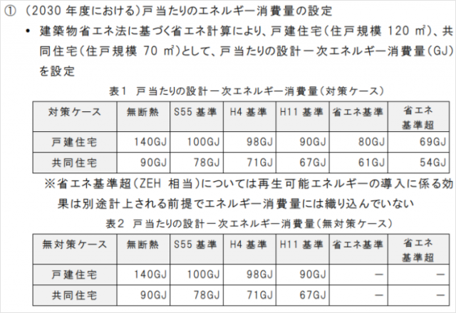 また、資料には、はっきりと「再生可能エネルギーの導入にかかわる効果は別途計上される前提でエネルギー消費量には織り込んでいない」とあるため、太陽光発電の自家消費を除いた、断熱と設備の高効率化のみのエネルギー消費削減効果で計算したことになる。