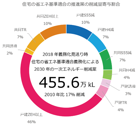 16年案とは逆に、適合義務化の寄与度は28%と低く、誘導政策の寄与度が72%まで上昇した。しかも、戸建てはZEH以上への誘導政策が、全体の約半分を占めるに至った。