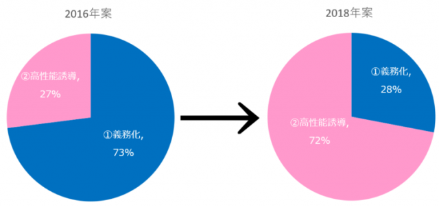 また、18年案でも「1、最低基準としての省エネ基準義務化による底上げ政策」と「2、高断熱、高効率設備による省エネ基準超えへの誘導政策」の2つの政策の寄与度をグラフ化してみた。