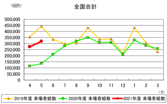 エリア別では、北海道、東北、関東、信越・北陸、東海、近畿、中国・四国、九州・沖縄の全8エリアが4月度に続き前年同月比プラスとなった。今期来場者累計は、59万2023組となり、昨年累計比でプラス136.05%の来場増となった。