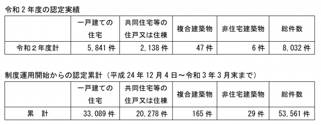 国土交通省は6月21日、「都市の低炭素化の促進に関する法律」に基づく、低炭素建築物新築等計画に関して、2020年度の認定実績を公表した。総件数8032件のうち、戸建て住宅が5841件、共同住宅(住戸または住棟)が2138件だった。戸建て住宅の年間認定件数は前年度から10.4%増加し過去最高を更新した。制度運用開始の2012年12月からの累計は、総数が5万3561件、戸建て住宅が3万3089件、共同住宅が2万278件。