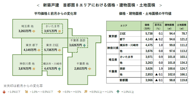 首都圏全体の平均価格は3966万円で、前月から0.1%下落したものの、「東京都下」「千葉県他」がわずかに下落。「東京23区」「横浜市・川崎市」「神奈川県他」「さいたま市」「千葉県西部」の5エリアは上昇し、いずれも2017年1月以降で最高額となった。