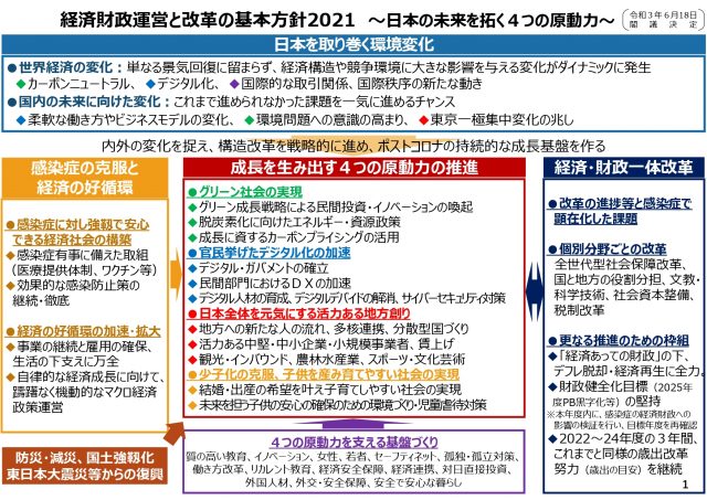 政府はこのほど、「経済財政運営と改革の基本方針2021」(骨太方針2021)を閣議決定した。
