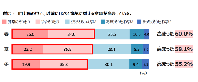 その結果、半数以上が「コロナ前と比べて換気に対する意識が高まった」と回答。春:60.0%、夏:58.1%、冬:55.2%と、季節による差があまり見られないことからも、コロナ禍によって人々の換気意識は高まり、定着したと言えそうだ。