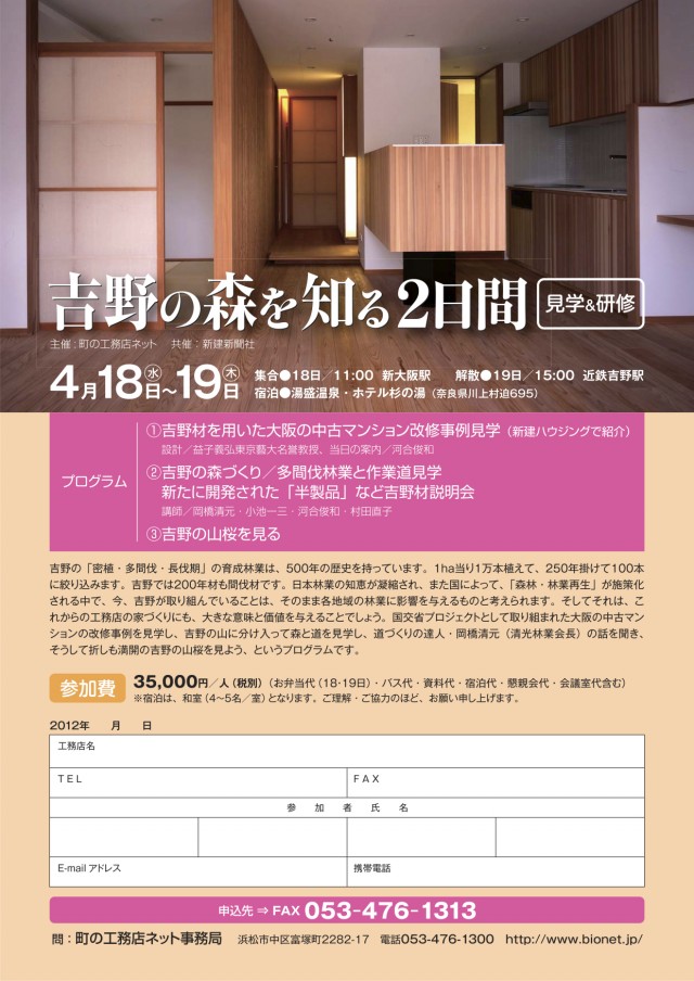 お申し込みは、以下をプリントアウトして必要事項ご記入のうえFAXいただくか、こちら→ 吉野ツアーチラシから申し込み用紙をダウンロードして(PDFファイルが開きます)必要事項ご記入のうえFAXをお願いします(お問い合わせ・送付先:町の工務店ネット)。