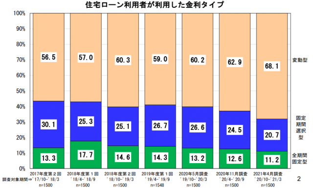 利用した金利タイプは「変動型」が68.1%と前回調査(2020年11月)から5.2ポイント増加した。「固定期間選択型」と「全期間固定型は」減少し、それぞれ20.7%、11.2%だった。変動型の利用割合は、新築マンションが最も多く、固定期間選択型と全期間固定型は、注文住宅の建て替えが最も多かった。全期間固定型のフラット35の利用者割合は約6割だった。
