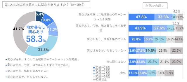 その結果、58.3%が「地方暮らしに関心がある」と回答。なかでも20代~30代に関心の高さが見られ、「すでに二地域居住やワーケーションを始めている」と答えた人のうち81.1%、「今後、地方暮らしをする予定」と答えた人のうち71.5%は20代~30代が占めた。