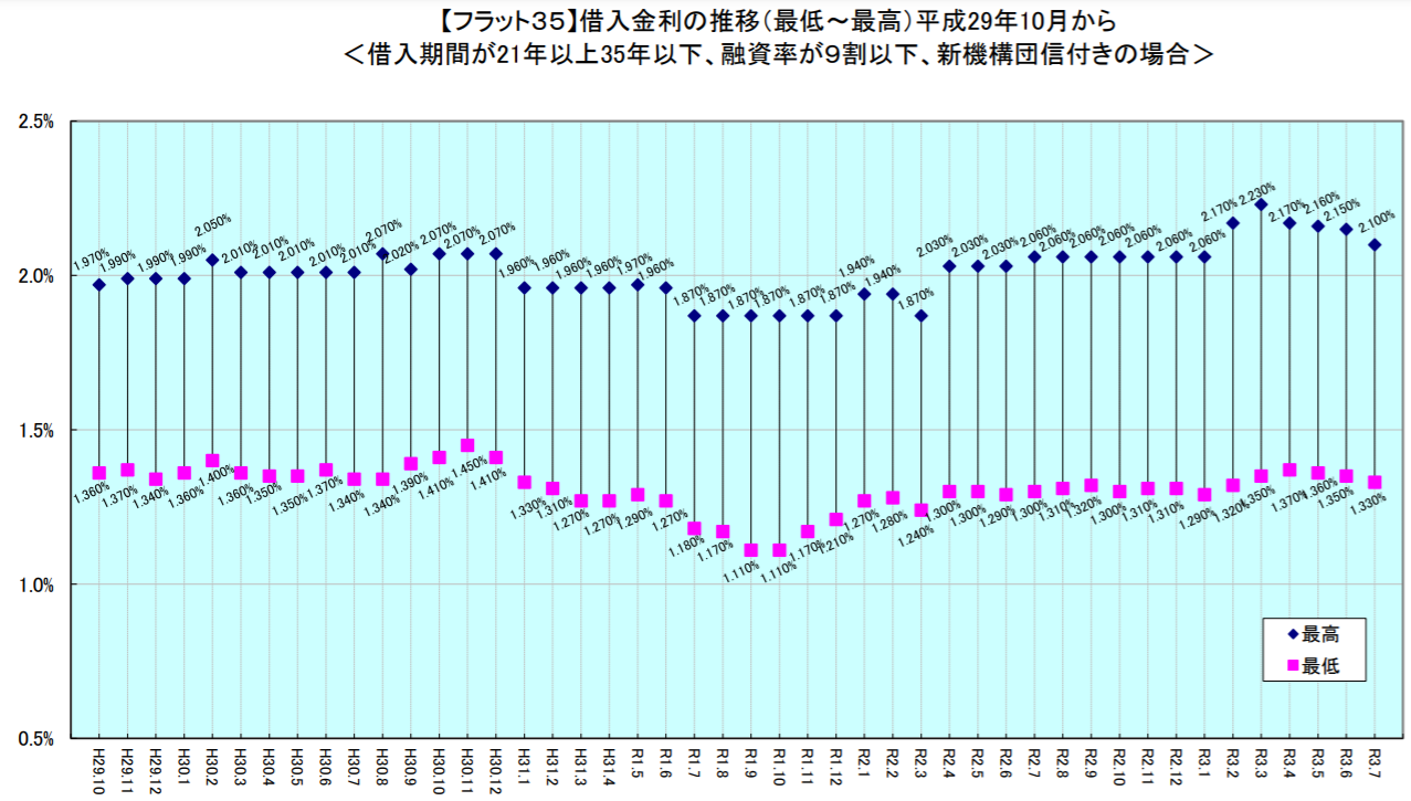 住宅金融支援機構(東京都文京区)は7月1日、住宅ローン「フラット35」取扱金融機関が適用する7月の融資金利を発表した。返済期間21年以上35年以下の最低金利は、融資率9割以下が1.33%、9割超が1.59%と、いずれも3カ月連続で下降。最高金利は、9割以下が2.10%、9割超が2.36%で、前月から0.05ポイント下がった。