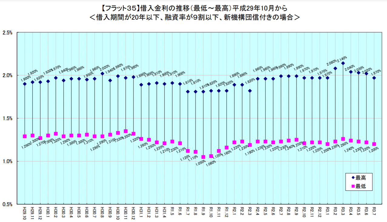 返済期間20年以下の「フラット20」の最低金利は、融資率9割以下が1.20%、9割超が1.46%で、いずれも前月から0.02ポイント下がり、4カ月連続の下降となった。最高金利は、9割以下が1.97%、9割超が2.23%で同じく0.05ポイント下がった。