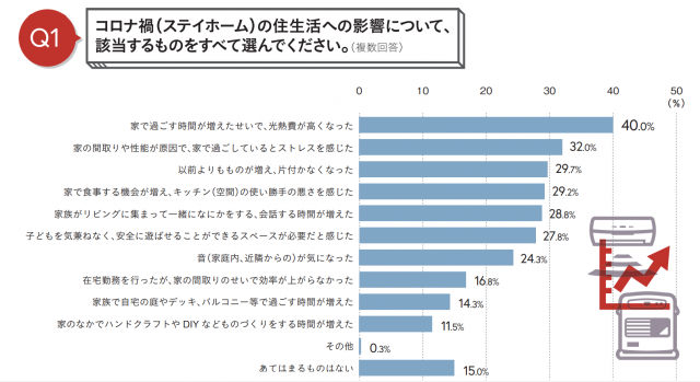今年大きく増えたのは「以前よりもものが増え、片付かなくなった」(29.7%)だ。仕事や勉強、娯楽や趣味など、自宅での行動が増えるにつれてものも増えたのだろう。また「間取りや性能が原因でストレスを感じた」「子どもを気兼ねなく、安全に遊ばせることができるスペースの必要性」「音(家庭内、近隣からの)が気になった」も増えている。これらも、ステイホーム期間の長期化によって顕在化、増大した悩みだろう。
