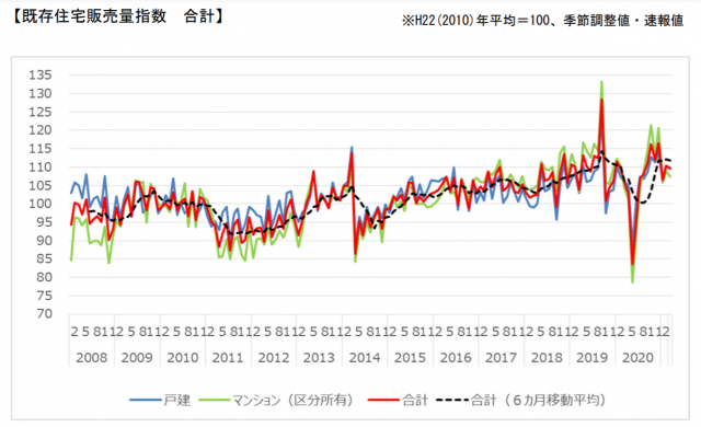 国土交通省は6月30日、登記データをもとに個人が購入した既存住宅の移転登記量を加工・指数化した2021年3月分の「既存住宅販売量指数」を公表した。戸建て・マンション合計・季節調整値は前月比0.7%減の109.6(前年同月比2.8%増)、床面積30m2未満を除いた合計・季節調整値は前月比2.0%減の103.8(前年同月比2.5%増)だった。