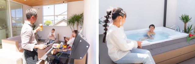 グランピングを自宅から移動時間ゼロで楽しめる「0秒グランピング」をコンセプトとするGLAMPにおいて、「遊びも仕事も自宅でする」新しい住宅の文化を提案する。大きな窓で屋内リビング・屋外リビングをつなぐことで、解放感とプライバシーを両立した大空間を作り上げた。1階に風呂や寝室などの生活スペース、2階にリビングとキッチンを配置し、広々とした空間で家族団らんを楽しめるようになっている。バーベキューグリルを標準搭載し、オプションでスカイバスも設置可能。関連会社のハウスクラフトで培った収納スペースや家の導線のデザイン力を生かし、すっきり暮らすための工夫も施されている。