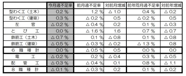 職種別の状況では、左官、鉄筋工(土木)、鉄筋工(建築)、電工、配管工で過剰、とび工で均衡、その他の職種で不足となっており、型枠工(建築)の不足率0.3%が最も大きい。