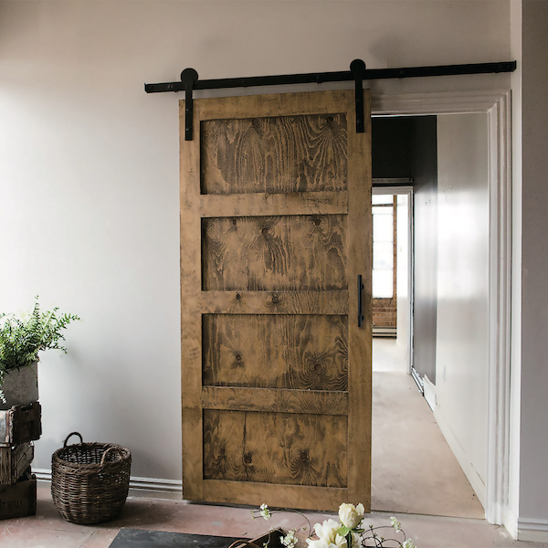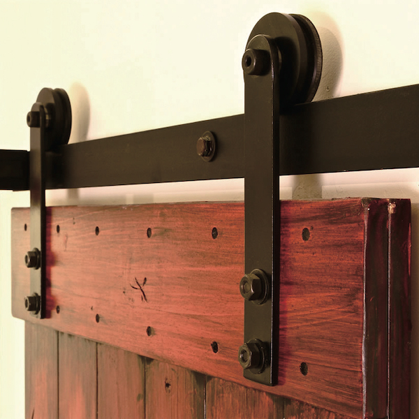 アメリカの納屋や倉庫で使われていた、スチールのドアレールが剥き出しの引戸「バーンドア」専用の金物。ソフトクローズ機構を搭載しており、扉の開きぎわ・閉まりぎわの動きをゆっくりさせることで高級感を演出する。