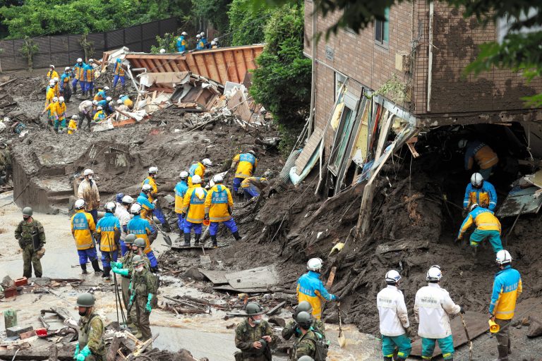 【写真提供=朝日新聞社】多くの家屋が倒壊した現場で捜索する警察官や自衛隊員ら=静岡県熱海市