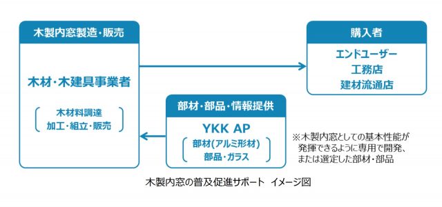 木材は各事業者が選定・加工し、YKK AP提供の部材・部品・ガラスを組み込んで、自社ブランドの木製内窓として販売する。同社はさらに、部品の取付要領、取り付けるための加工要領といった情報を提供するとともに、木製内窓の性能試験にも協力するとしている。