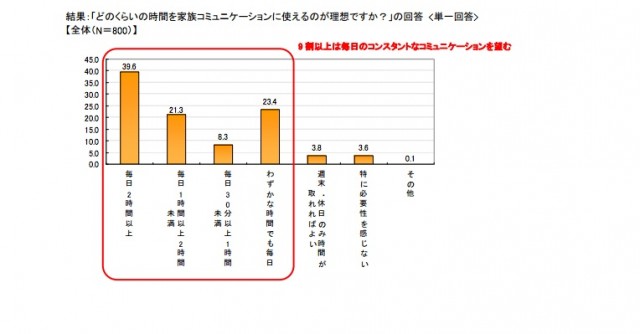 調査では、約9割が毎日の家族コミュニケーションを希望。このうち約4割(39.6%)が「毎日2時間以上」のコミュニケーションを理想に挙げた。年代別にみると30代男性の50%、30代女性の54.6%が毎日2時間以上と回答、前回調査(2010年9月)より1.3倍に増えていた。