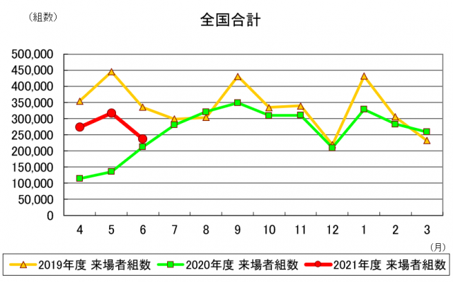 エリア別では、東北、関東、信越・北陸、東海、中国・四国の5エリアが5月に続き前年同月比プラスとなった。北海道、近畿、九州・沖縄の3エリアは今期初めての来場減となった。今期来場者累計は、昨年累計比179.32%の83万255組。