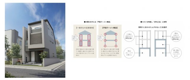 オリジナル構法とは、大開口が可能な「門型ラーメン構造」と、コストに配慮した独自工法「SPG(ストロング・ポスト・グリッド)工法」を組み合わせたもので、間取りに応じてムダのない工法選択が可能になるという。