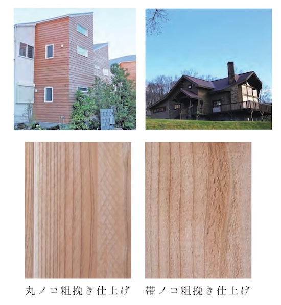 これを使った2種類の防火構造(グラスウール断熱材、吹付硬質ウレタンフォーム)が国土交通省防火構造認定を取得。準防火地域、22条区域の延焼の恐れのある部分にも使用することができる。 外壁用は粗挽き仕上げで、サイズによって「丸ノコ粗挽き」「帯ノコ粗挽き」をラインアップ。