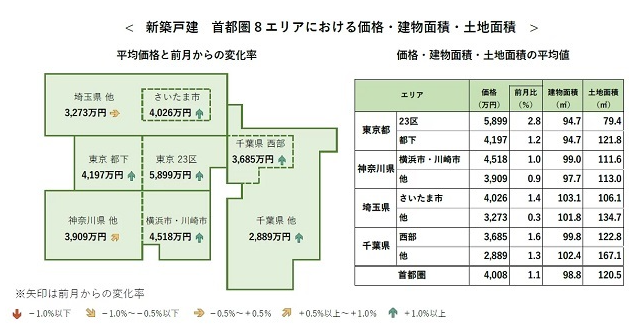 首都圏全体の平均価格は4008万円で、前月比1.1%上昇。4000万円を超えたのは2007年1月以来となる。8エリア全てで前月比上昇となり、東京都(23区/都下)、神奈川県(横浜市・川崎市/他)、埼玉県(さいたま市/他)、千葉県西部の7エリアで過去最高額となった。