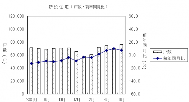 国土交通省は7月30日、6月の新設住宅着工戸数を発表した。分譲住宅は減少したが、持家と貸家が増加し、全体で前年同月比7.3%増の7万6312戸と4カ月連続の増加となった。季節調整済年率換算値は、前月比1.0%減の86.6万戸で2カ月連続で減少した。