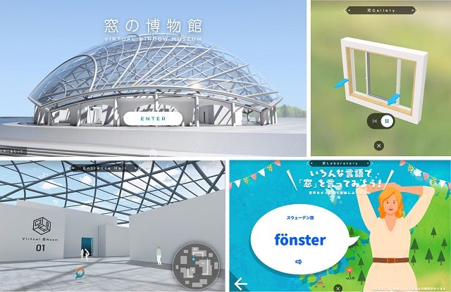 「窓の博物館」は、日常生活の中で意識することが少ない「窓」を、自宅で手軽に楽しみながら知ることができる体験・体感型のWEBコンテンツ。ガラス張りのドーム状の建物の中で、「Virtual 窓 Room」「窓 Gallery」「窓 Laboratory」の3つの展示施設を展開している。各コンテンツ内では、「窓」の種類を分かりやすく紹介するほか、「窓」にまつわる豆知識やクイズ、世界13か国の言語での「窓」の発音などを紹介。「窓 Gallery」では、3Dで上下左右など普段見ることのできない角度から窓を観察することができる。