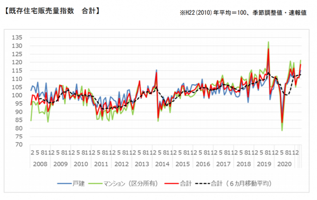 国土交通省は7月30日、登記データをもとに個人が購入した既存住宅の移転登記量を加工・指数化した2021年4月分の「既存住宅販売量指数」を公表した。戸建て・マンション合計・季節調整値は前月比6.9%増の118.7(前年同月比16.2%増)、床面積30m2未満を除いた合計・季節調整値は前月比7.0%増の112.5(前年同月比13.4%増)だった。