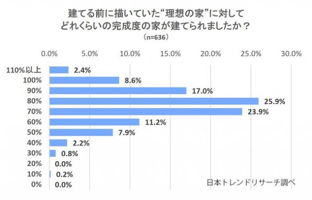 建てる前に描いていた“理想の家”に対して、どれくらいの完成度の家が建てられたか聞いたところ、最も多かったのは「80%」で25.9%の人が回答した。次いで「70%」(23.9%)、「90%」(17.0%)となった。「110%」と理想を超える家が建てられたという人も2.4%いる一方、約1割の人は「50%以下」と回答した。