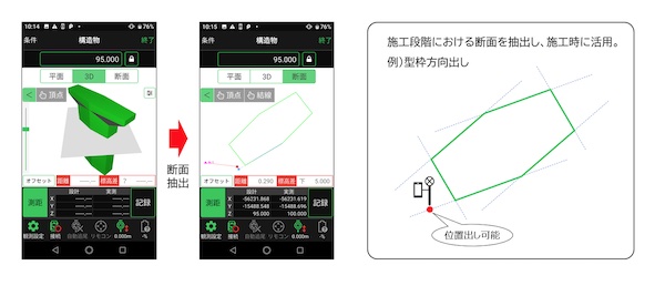 最新版では、測器の対応機種を拡大。ソフトバンクのGNSS配信サービス「ichimill(イチミル)」への対応も開始した。また、国土交通省が試行を進めている「3次元計測技術を用いた出来形管理要領(構造物工編)」への対応として、構造物のモデル計測機能を大幅に強化した。断面抽出機能では、施工段階の断面を抽出し型枠の方向出しなどがスムーズに行える。