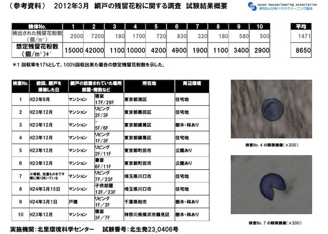 NPO法人 日本ハウスクリーニング協会(東京都新宿区)は、北里環境科学センターの協力のもと2012年の花粉飛散シーズンに網戸に花粉などの汚れがどの程度付着しているかを調べる「網戸残留花粉の実態調査」実施。このほど3月に採取した残留花粉の計測結果をまとめた。