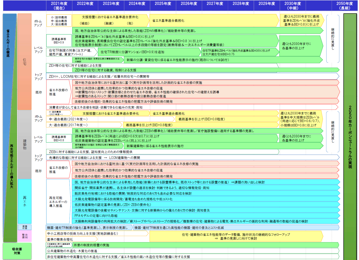 修正案においても、省エネ基準適合義務化の年限は2025年度と変わらず。2050年度の長期目標も「ストック平均でZEH・ZEB基準の水準の省エネ性能が確保されている」と、修正前の水準を堅持した。ただし、30年度の目標は、新築住宅を「ZEH基準の省エネ性能」に「適合させる」と、実質的にはZEH水準を義務化(省エネ基準の引き上げ)する表現に改められた。