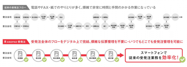 今年5月には、建設業法・電子帳簿保存法などに対応した電子受発注システム「ANDPAD受発注」をリリース。タイムスタンプや電子署名などの機能を備え、工事請負契約や見積もり、請求業務にも対応。受発注双方のやりとりがデジタル上で完結できるシステムとなっている。グレーゾーン解消制度を活用し、国土交通省から建設業における適法性を確認済み。