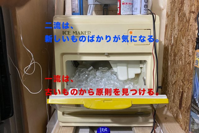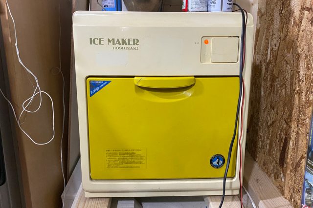 そう広くはない仕事場には、様々な機械や道具がところせましと並んでいます。そのすきまにしゃがんで氷を取り出してくる、その場所をよく見ると洗濯機パンの上にカラシ色の箱が。「?」と思い尋ねてみると、それはホシザキ製の古い業務用機種でジャンク品としてヤフオクで6,000円で買ったものとの事でした。どうもポンプのモーターが壊れていて、メーカーのサービスマンも「パーツが無いので直せない」という代物だったそうです。