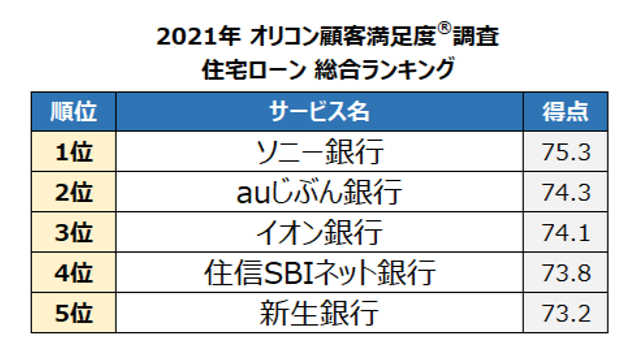 「オリコン顧客満足度」を展開するoricon ME(東京都港区)はこのほど、「住宅ローン」についての満足度調査を実施した。その結果、「ソニー銀行」が11年連続で総合1位となった。