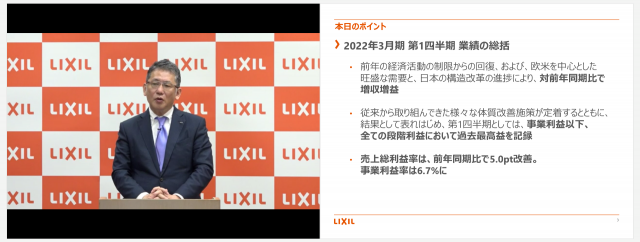 LIXIL(東京都江東区)は、このほど2022年3⽉期第1四半期の決算短信を発表した。同社の発表によると売上高、経常利益、最終利益ともに昨年度を上回る結果となっている。売上収益は海外事業を含めて3458億円と昨年同期比で11%の増収を記録。一方、事業利益は231億円となり、昨年同期比で257億円の増益を示した。また最終利益も168億円と昨年同期比で205億円の増益を示している。なお、事業利益および最終利益は、同社にとっての第一四半期決算結果としては過去最高益となっている。