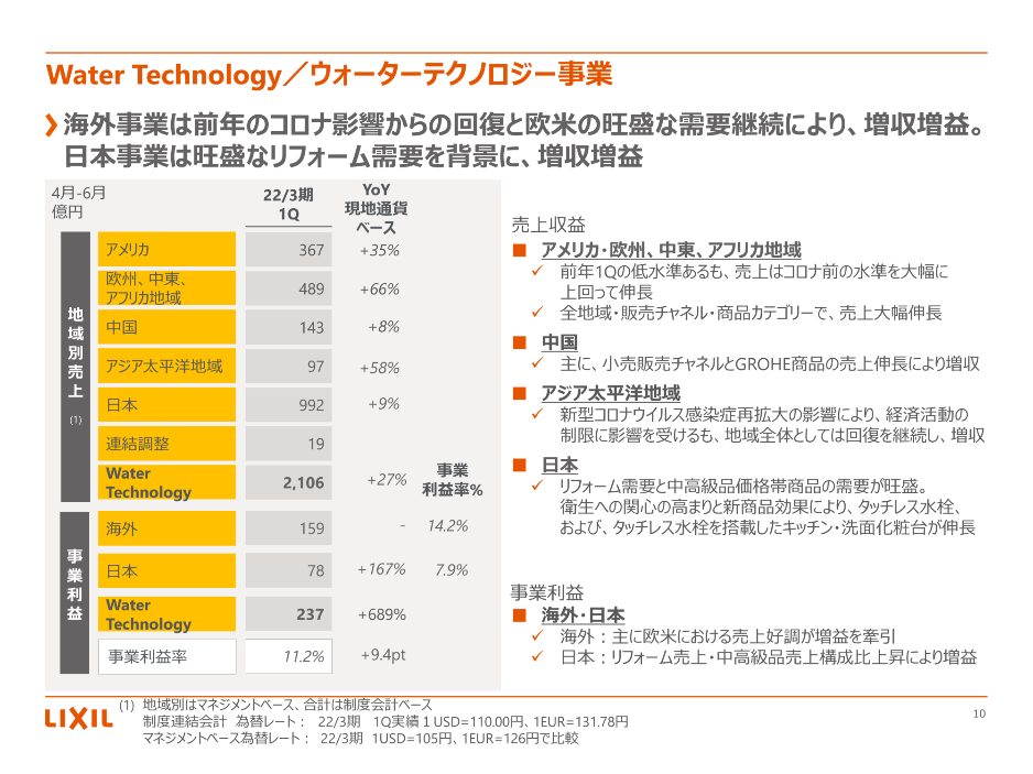 全社の売上高および増益に貢献したLWT事業では、第一四半期売上高は2106億円(昨年1655億円)と、451億円の増収となっている。事業利益も237億円(昨年30億円)を示しており、大きく伸長した。LWT事業の海外事業部門は、前年の新型コロナウイルス感染拡大の影響から一転、欧⽶の需要は回復基調を示しており、結果として増収増益につながった格好だ。その他、中国、アジア太平洋地域など主要な事業領域でもプラス成長を見せており実績は堅調な推移を示している。