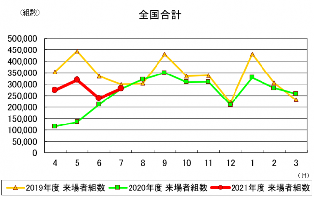 エリア別では、関東、東海、近畿、中国・四国の4エリアが前年同月比プラスとなった。北海道、東北、信越・北陸、九州・沖縄の4エリアはマイナス。今期来場者累計は、111万1655組となり、昨年累計比でプラス49.59%の来場増となった。