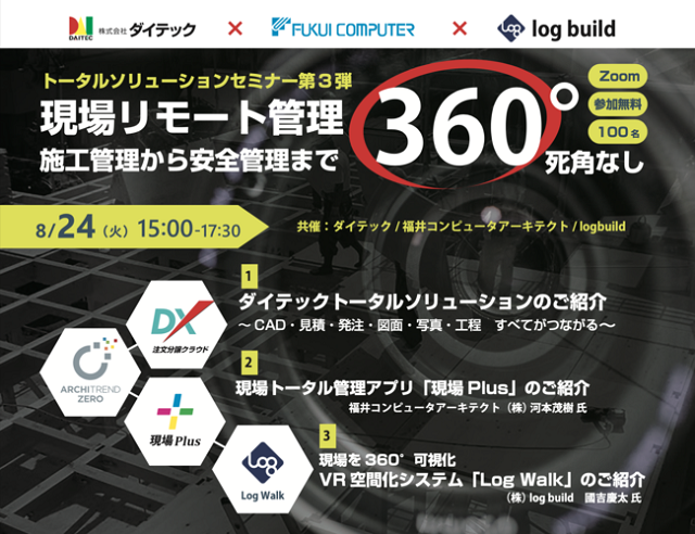 今回の協業開始に伴い、8月24日に、ダイテック、ログビルド、福井コンピュータアーキテクトと共催でZoomウェビナー「現場リモート管理 施工から安全管理まで360°死角なし」を開催する。