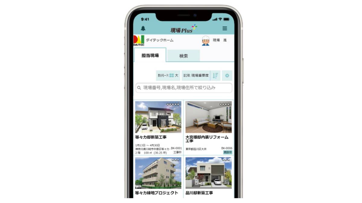 「現場Plus」は、月額1万円(60ID)から利用できる現場トータル管理アプリで、工程、図面、写真、コミュニケーションなどの情報共有に加え、就業・安全管理までサポート。基幹システムの「注文分譲クラウドDX」と連携することで、顧客管理から商談、アフターまで住宅業に必要な業務を一貫処理することが可能となる。