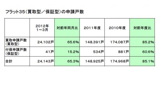2012年1月〜3月のフラット35買取申請戸数は2万4102戸、付保申請戸数は41戸だった。この期間に同機構が買い取った実績戸数は2万7857戸、住宅融資保険(保証型)が付保された実績戸数は94戸。結果、11年度の買取申請戸数は14万8391戸、買取実績戸数は11万140戸となった。