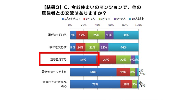 一方、現状では挨拶以上の交流をしている人は少なく、1割弱は「挨拶を交わす人がひとりもいない」、約4割(38%)が「立ち話をする人がひとりもいない」という結果となった。